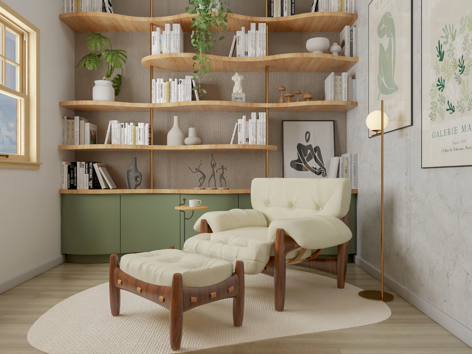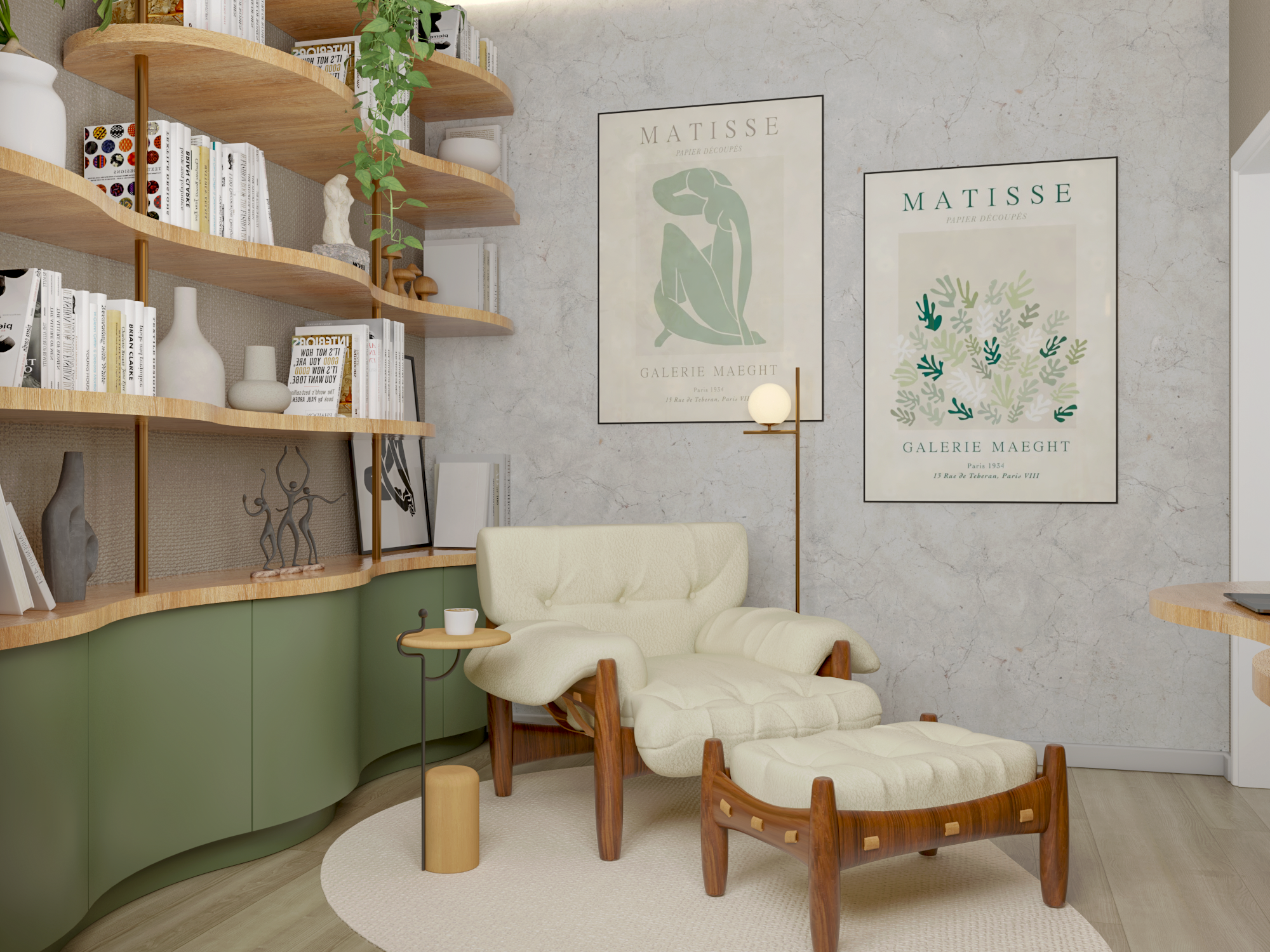 As prateleiras orgânicas remetem ao natural e ao design biofílico, proporcionando maior suavidade ao espaço.